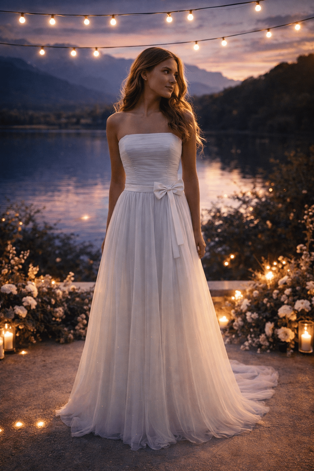 Elegante, strapless bruidsjurk van fijne witte tule die een romantische en luchtige uitstraling creëert. Het nauwsluitende lijfje accentueert subtiel het silhouet en loopt over in een zwierige rok van meerdere lagen zachte tule, die sierlijk meebeweegt bij elke stap. De taille wordt verfijnd benadrukt door een subtiel detail, wat zorgt voor een vrouwelijke en tijdloze look.