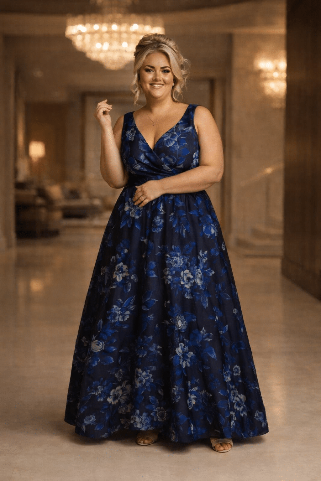 De subtiele bloemenprint voegt een zachte, verfijnde touch toe, waardoor deze jurk perfect is voor bruiloften, gala’s, diners en speciale gelegenheden.