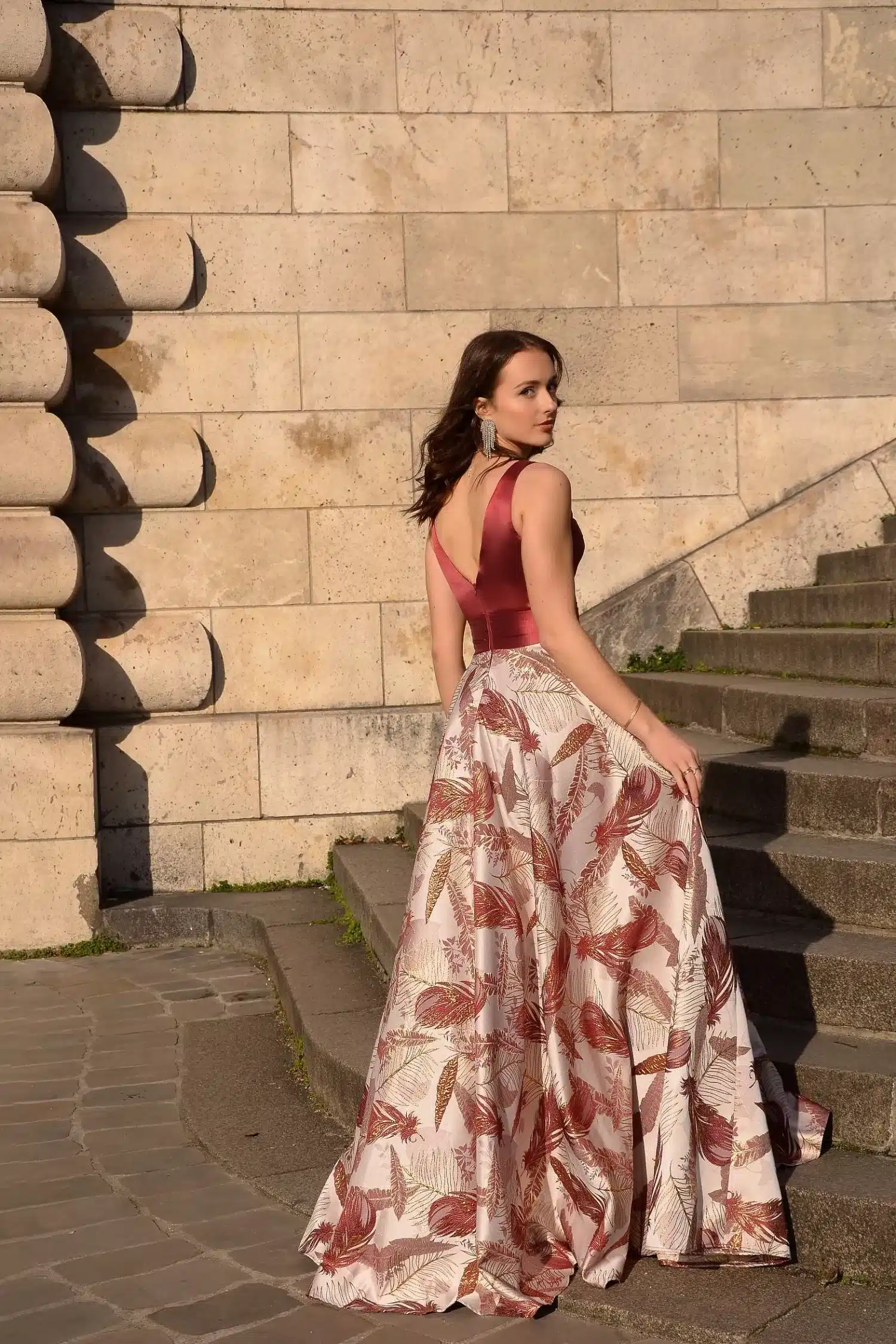 Deze prachtige jurk valt op door de bijzondere rok met verfijnd verenpatroon, wat zorgt voor een luxe en speelse uitstraling. De aansluitende top en volle rok creëren een elegante, vrouwelijke pasvorm. Perfect voor gala’s, bruiloften en andere speciale gelegenheden.