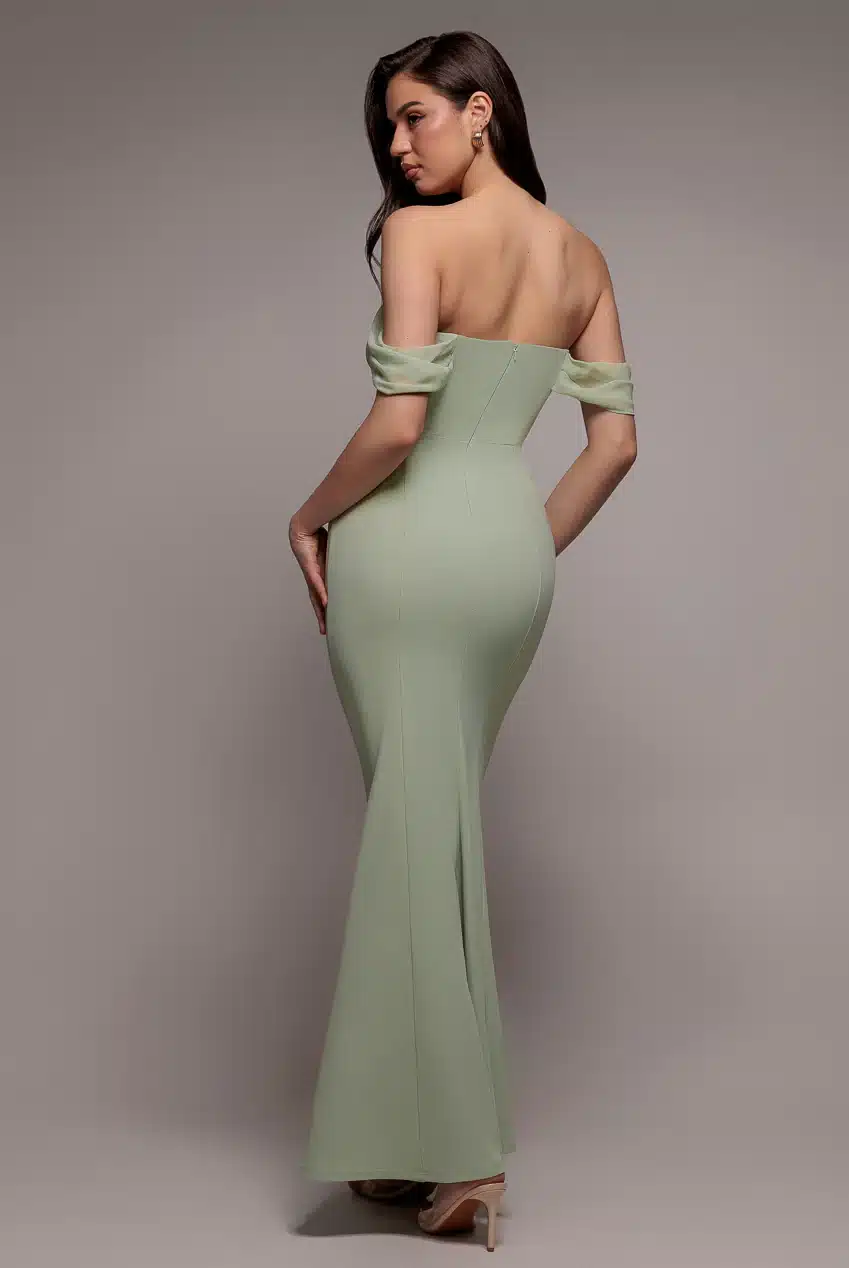 Elegante off-shoulder jurk in een zacht mint groene tint, de aansluitende pasvorm en subtiele pooien accentueren het silhouet, terwijl de gedrapeerde mouwen zorgen voor een vrouwelijke en verfijnde uitstraling. Perfect voor gala’s, bruiloften en/ of speciale gelegenheden.
