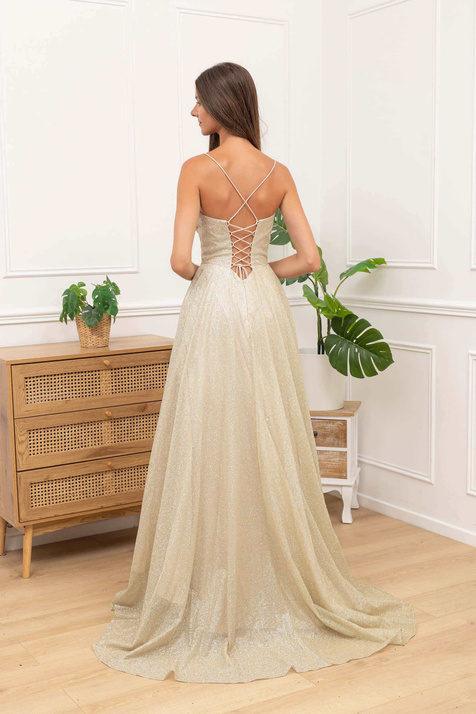 Deze galajurk van luxueuze glitterstof heeft een elegante pasvorm die je figuur prachtig laat uitkomen. De jurk valt soepel, voelt comfortabel aan en geeft je gegarandeerd een sprankelende uitstraling op elk gala of feest.