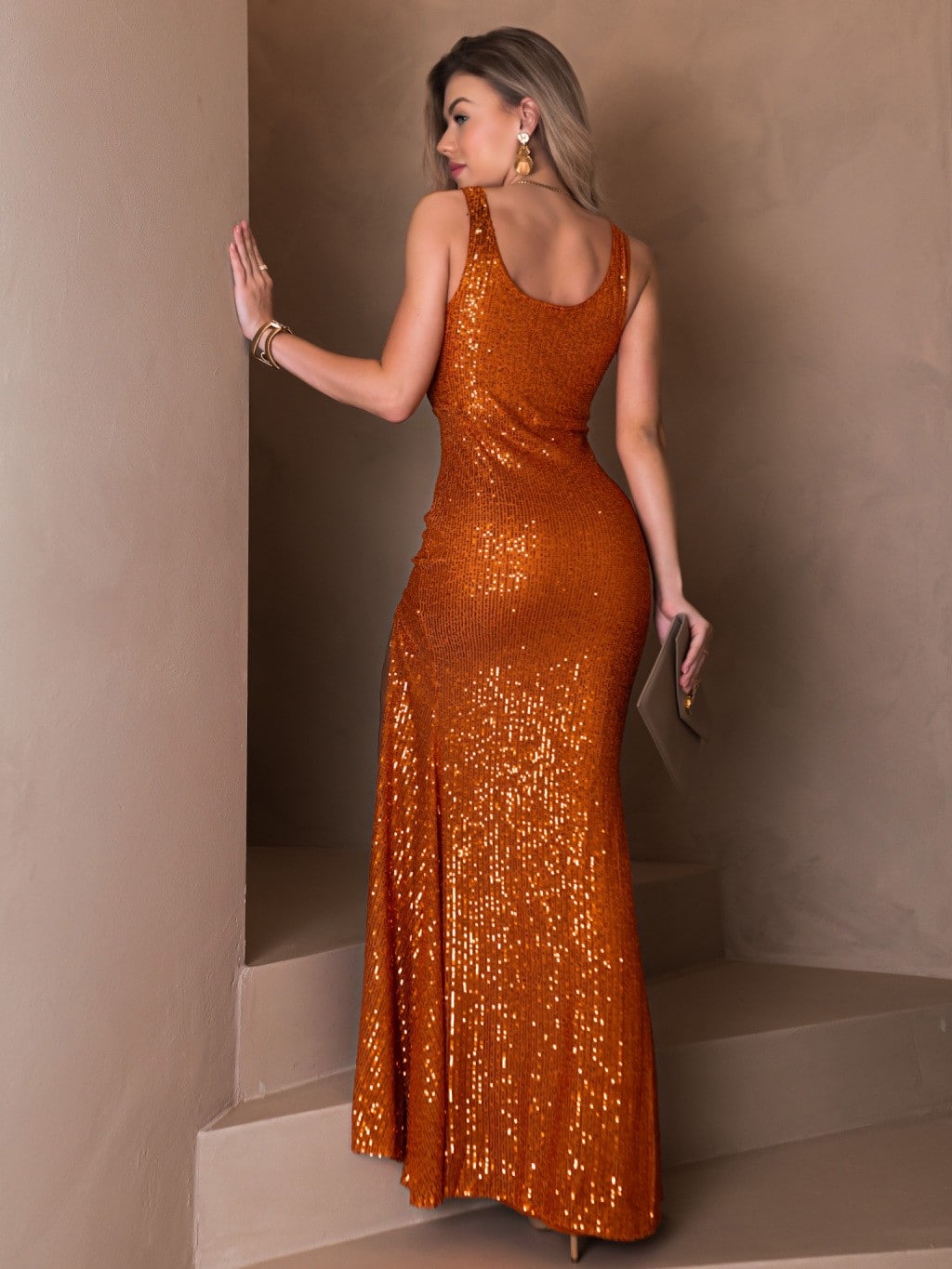Deze prachtige galajurk in brique kleur is volledig bezet met glinsterende pailletten die je bij elke beweging laten stralen. De aansluitende pasvorm accentueert je silhouet, terwijl de vloeiende rok zorgt voor een elegante afwerking. Perfect voor gala’s, feesten en speciale gelegenheden waarbij je wilt schitteren.