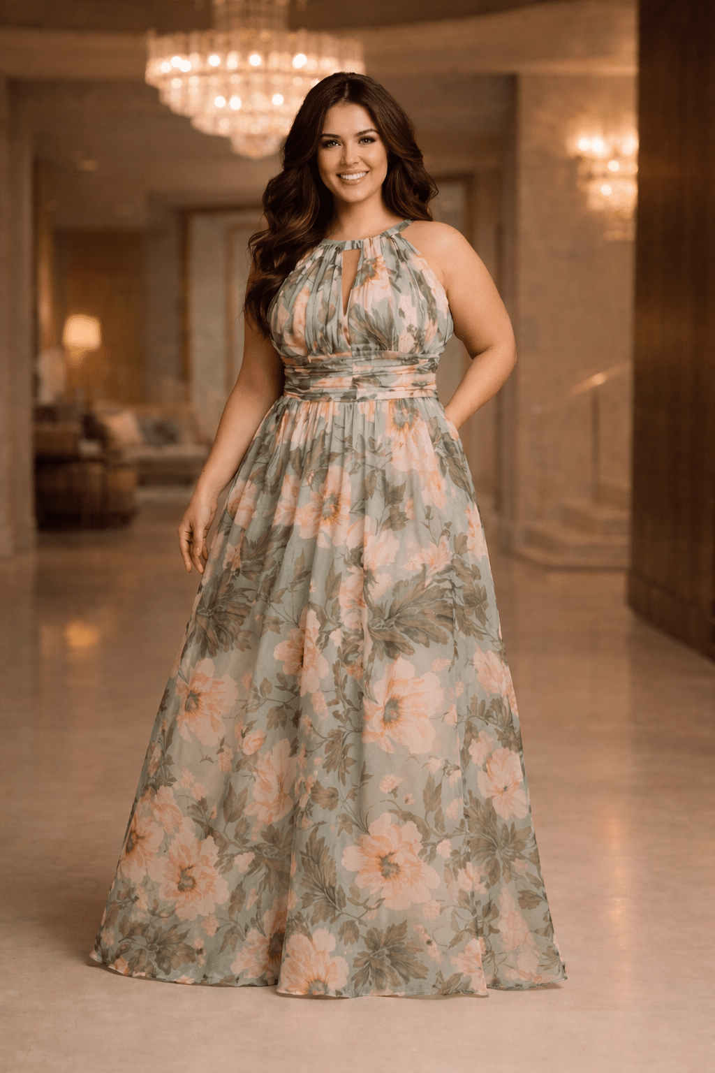 De zachte bloemenprint geeft de jurk een romantische en luxe touch — perfect voor bruiloften, gala’s, feestelijke diners en speciale gelegenheden.